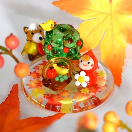 澄みきった秋の空気のなかをヒラヒラと舞い降りるもみじに誘われて、森の仲間たちが集まってきました。